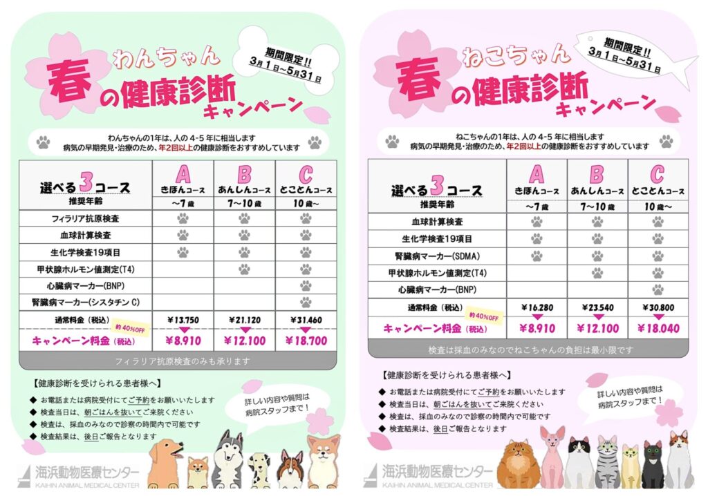 本年も、わんちゃん・ねこちゃん共に、3つの健診コースからお選びいただけます